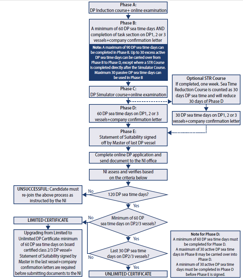 For new Nautical Institute certified DP Operators, please find Nautical Institute’s site www.nialexisplatform.org and click on “DP Information Centre” then “New Offshore DP Scheme” then “Requirements - New Offshore Scheme” to read about the training scheme requirements to become a DPO.